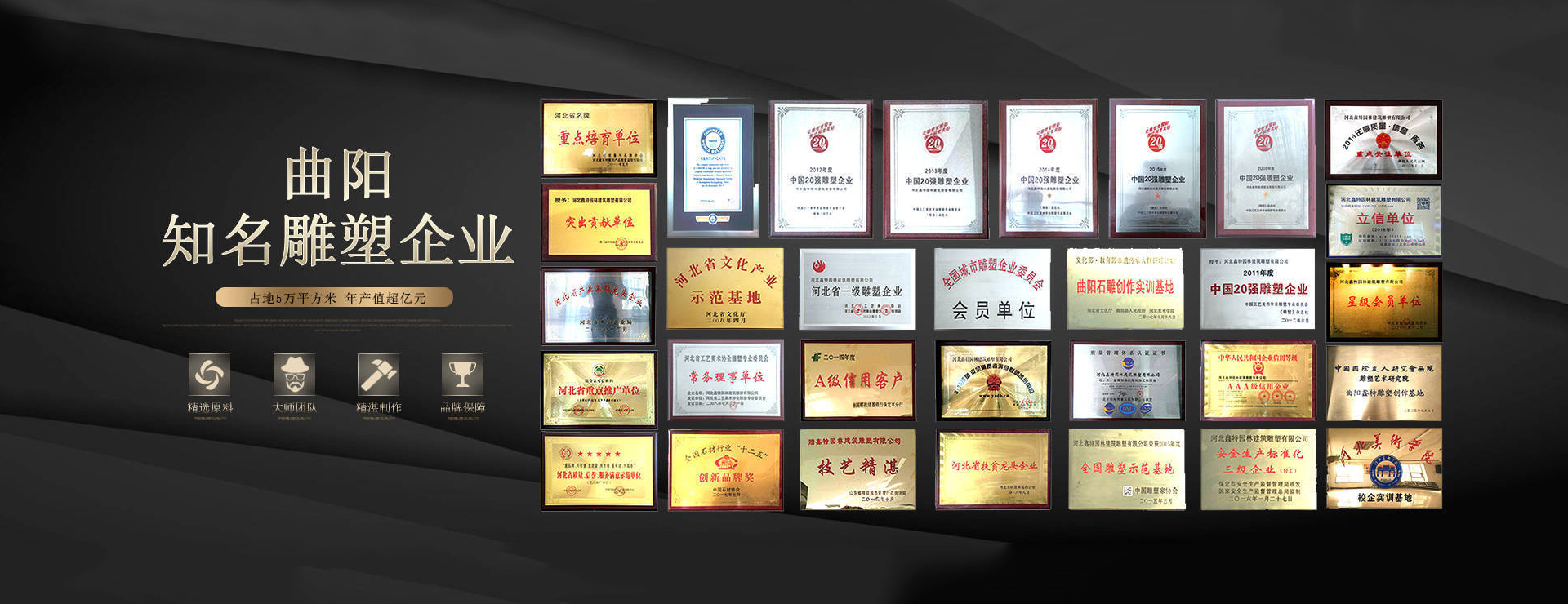 同時,公司也是行業(yè)內(nèi)的佼佼者,連續(xù)七年榮獲“中國20強雕塑企業(yè)”,并被命名為“全國雕塑示范基地”,在國內(nèi)外雕塑藝術(shù)領(lǐng)域享有較高聲譽。2017年,曲陽縣河北鑫特園林雕塑公司還被文化部、教育部、人社部命名為“中國非遺石雕傳承人群研培實訓(xùn)基地”。